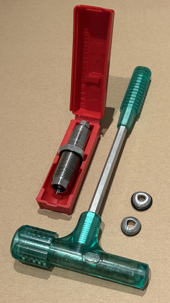 Ein Set aus LEE Universal Entzündermatrize zum Zündhütchenausstossen und einem RCBS Geschosszieher Hammer kinetisch Bullet Puller.