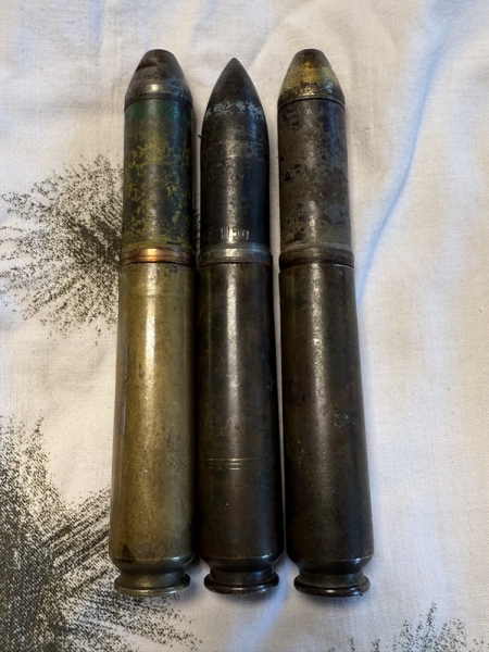 Zum Verkauf kommen drei originale Deko Patronen für das 2cm MGFF von der Wehrmacht.