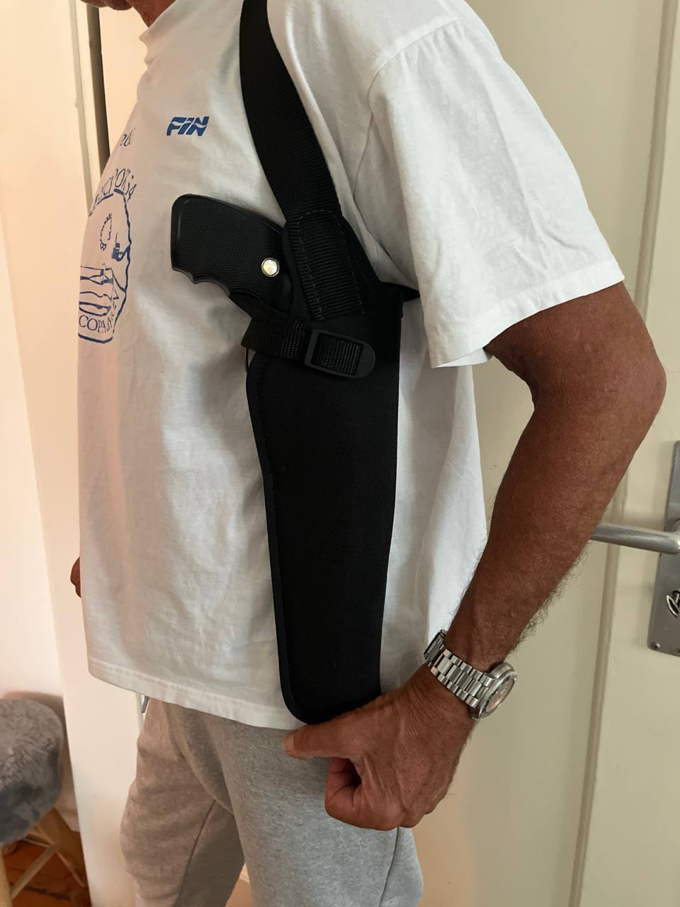 allseitig einstellbares Schulterholster aus stabilem Cordura, Rechtshand, geschlossen am Lauf, mit einem mittels Schieber stufenlos einstellbaren Verschluss. Hier die Rückseite