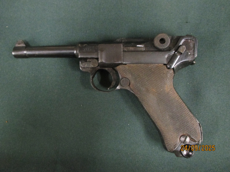 Schöne Pistole 08 gebaut 1941 von Mauser (byf), nummerngleich mit gutem Lauf. Äußerlich kleine Rostnarben, siehe Fotos, die Pistole wurde in der Vergangenheit bereits einmal überarbeitet. Das originale Magazin ist mit Hersteller fxc gestemplet und hat einen Kunststoffboden. Nur Originalbestempelung, keine Fremdstempel.