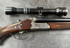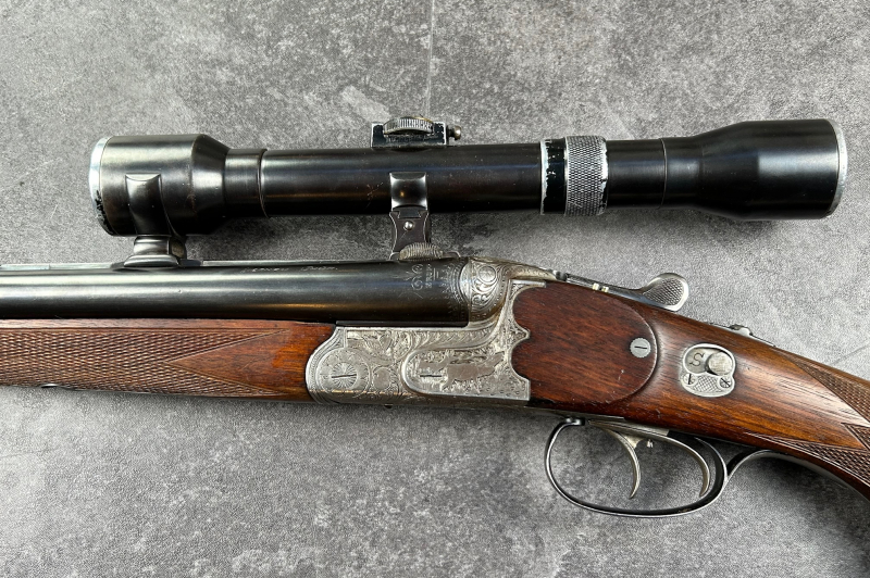 Drilling von August Jung in Suhl, Vorkriegsfertigung, 1971 wurde der 5,6x50 R Magnum Lauf eingelötet und auf 16/70 aufgerieben, mit Neubeschuß, schöne alte Suhler Gravur, Stahlglas 4x81, mit gut sitzender Einhakmontage, Abs.1 mit klarem Bild, LL ist 60 cm, Schaftlänge 35 cm, Technisch voll in Ordnung, Schaft wurde aufgearbeitet oder irgendwann neu geschäftet.