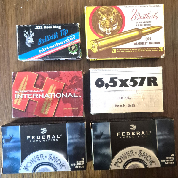 Originalverpackte Jagdmunition, je Schachtel 20 Patronen.