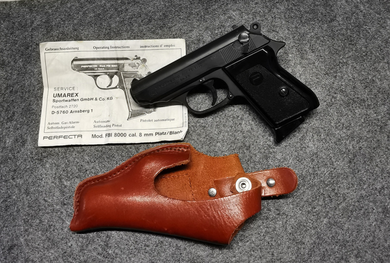 Sie bieten auf eine Schreckschusspistole der Firma Perfecta / Umarex. Sie ist ein Nachbau der Walther PPK im Kaliber 8mm Knall. Die Waffe ist eigentlich in einem ordentlichen Zustand, jedoch wurde sie viele Jahre ungereinigt und nicht geölt im Holster gelagert. Dadurch oder durch das Lederholster hat sie Stellenweise Korrosion angesetzt. Ansonsten ist die Brünierung in einem guten Zustand. Die Pistole ist voll funktionsfähig. Der Beschuss wurde 1988 in Köln durchgeführt. PTB: 196/2. Die Auktion umfasst die Waffe inkl. Magazin mit Gebrauchsanweisung und Holster. Bitte beachten Sie die Bilder. Frei ab 18 Jahre. Es handelt sich hier um einen Verkauf von Privat, daher keine Garantie oder Rücknahme.
