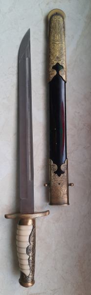 Japanischer Dolch mit Scheide.Klinge scharf geschliffen. Gesamtlänge ca.39cm Klingenlänge ca.27cm.Zum Alter und Herkunft kann ich leider keine Angaben machen. Privatverkauf kein Umtausch und keine Rücknahme.