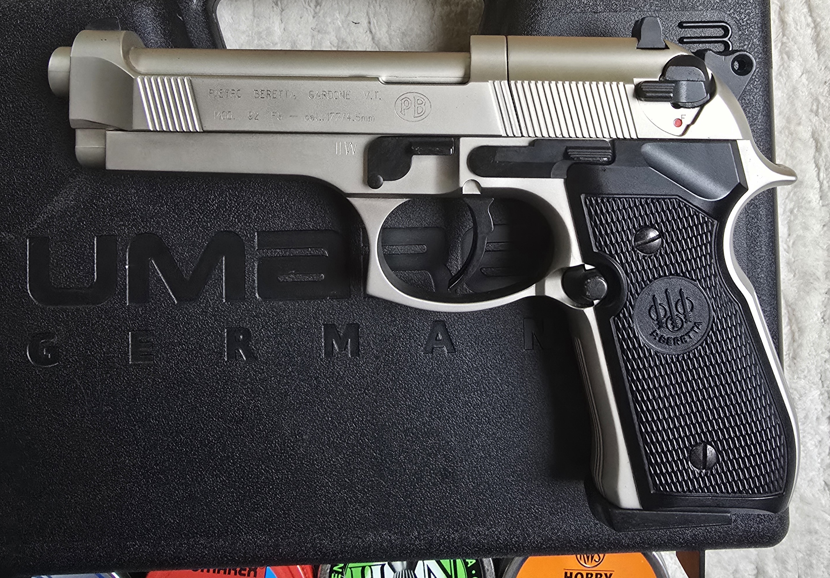 Verkaufe hier eine tolle Beretta CO2 Pistole M92 FS in schwerer Vollmetall-Qualität und vernickelt. Sehr gepflegter und kaum benützter Zustand, im Lieferumfang enthalten: Pistole M92 FS, 4 x 8 Schuss Trommelmagazin, Bedienungsanleitung. Made in Germany for Crosman. Kennzeichnung mit F im Fünfeck. Top-Präzision und TOP-Qualität. Das Trommelmagazin wird mittels dem Fast-Action-System geladen. Maximal 3,5 Joule. Länge 210 mm, Lauflänge 114,60 mm, Abzug Double-Action. Sicherung: Abzugssicherung, Schlagbolzensicherung. Robuste und kratzfeste Oberfläche. Rutschsichere Griffschalen aus Kunststoff. Visierung: seitenverstellbare Kimme, Balkenkorn. Sportpistole im Kaliber 4,5 mm Diabolo. Ideale Sport- und Trainingswaffe. Bei Fragen können Sie sich gerne an mich wenden. Alle Fotos zeigen den Originalartikel.
