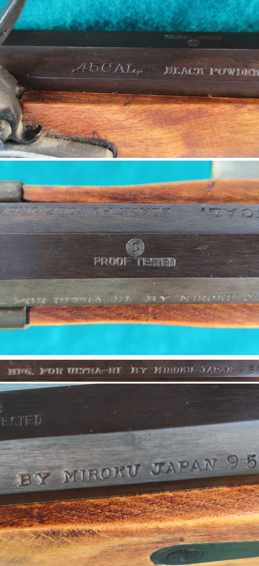 Braunierter achtkantiger Lauf, Kal. 45. gezogen, oben und seitlich beschriftet Hersteller Miroku Japan, Black Powder only, usw., Siehe Fotos. Im Schwalbenschwanz verschiebbare Kimme und Korn. Steinschloß mit zwei Rasten, gute Funktion. Messingbeschläge. Gemaserter Schaft. Gesamtlänge 127cm. Versandkosten innerhalb D 45,- Euro per DHL Paket inkl. Service Sperrgut.