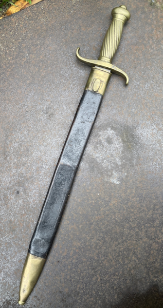 Preußen, Artillerie Faschinenmesser M 1849, vom 1. Garderegiment Potsdam, nicht ganz nummerngleich. Klingenlänge 47,5 cm. Als M1852 dann auch bei der Infanterie geführt. Abnahme auf Klingenrücken FW51, Hersteller:S&K, Lederscheide ist nicht trocken, Stück passt sauber rein. Schraube und die beiden kleinen Scheidenbeschlagklammern fehlen. Lässt sich ergänzen, im ganzen ein wirkliches Schmuckstück mit direktem Bezug auf die Potsdamer Garde, siehe Bilder
