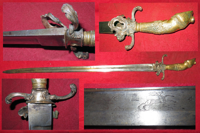 Der Griff ist ausgefallen gestaltet, mit Rehhuf Motiv und durchbrochener Rokoko-Muschel mit Restvergoldung.