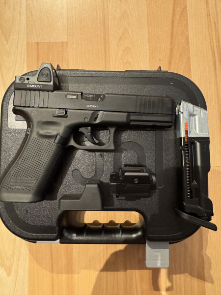 Die Glock wurde mit G-MOUNT RMR Red Dot Montage für Glock 0.43 T4E versehen und natürlich mit RMR Red Dot LED (verstellbar).