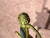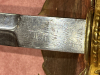 Die flache zweischneidige Vierkantklinge ist glatt, ohne Kehlung, minimal bis leicht fleckig und quartseitig eine für mich nicht lesbare Gravur auf der Fehlschärfe.