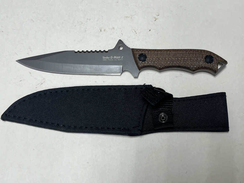 aus 420-Stahl, rostfrei, mit Rückenverzahnung. Mit brauner G-10