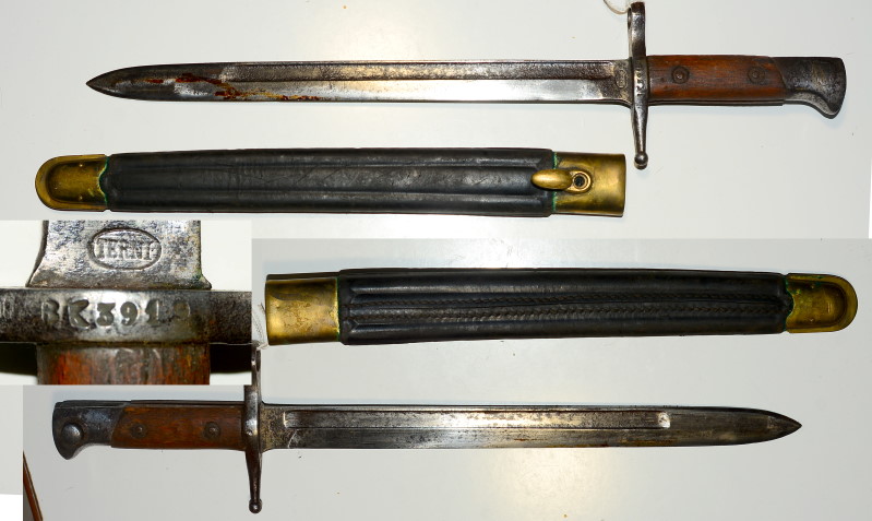 Italienisches Bajonett M1891 für Carcarno Gewehr, 29,8cm Klingenlänge, stärkere Rostspuren, Klinge durch Lederschrumpfung ca. 4mm zu kurz, ansonsten sind das Bajonett in mittlerem und die Scheide in gutem Zustand