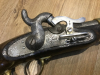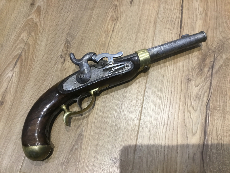Verkauft wird eine preußische Perkussionspistole, Modell M1850. Stark gebrauchter Zustand, siehe Bilder. Metall gereinigt von Rostspuren, der oftmals fehlende Pistonschutz wurde in späterer Zeit durch ein Neuteil ersetzt. Schraube unten am Griffstück fehlt, Schraubenkopf unten am Knauf stark beschädigt. Trotzdem alles fest und stabil, nichts wackelt. Mechanische Funktion aber voll gegeben und sehr gut. Schlossplatte mit Danzig gestempelt, oben am Lauf 1858. Regimentsstempel am Abzugschutz. Ich benötige definitiv einen Altersnachweis (bitte unaufgefordert). Zahlung bitte zügig nach Kauf erledigen, Versand erfolgt umgehend mit Sendungsnummer.