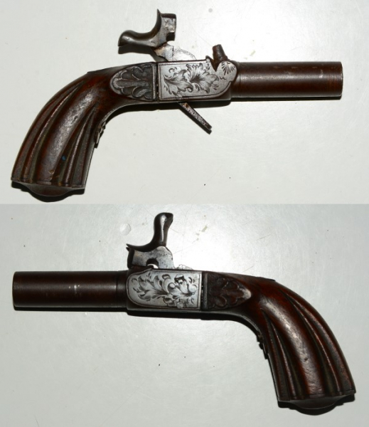 Perkussionspistole, sehr kleines Terzerol, abschraubbarer Lauf, gravierter Kasten, im Kolben Fach für Zündhütchen, Lauflänge 37mm, Gesamtlänge 12 cm, Kaliber 7,7 mm, guter Zustand mit Gebrauchsspuren, der Hahn hält nicht in der Sicherungsrast. Um 1850/60.