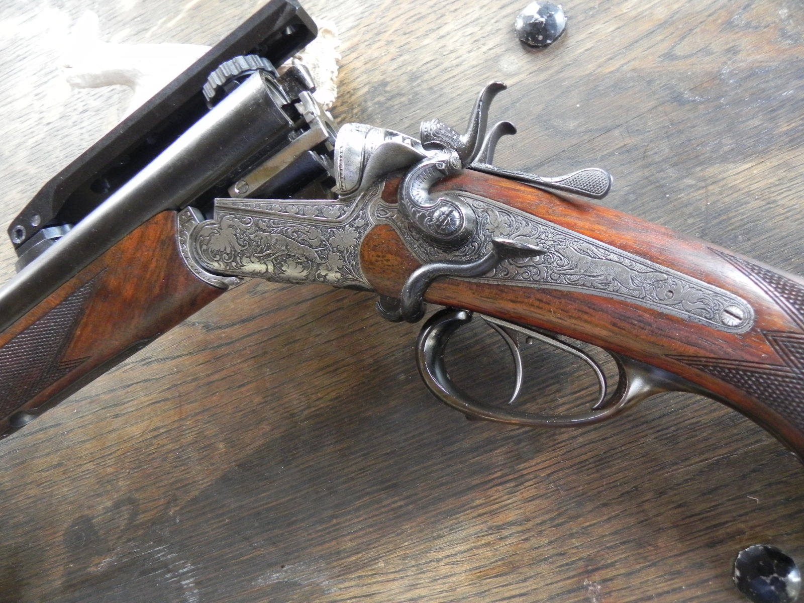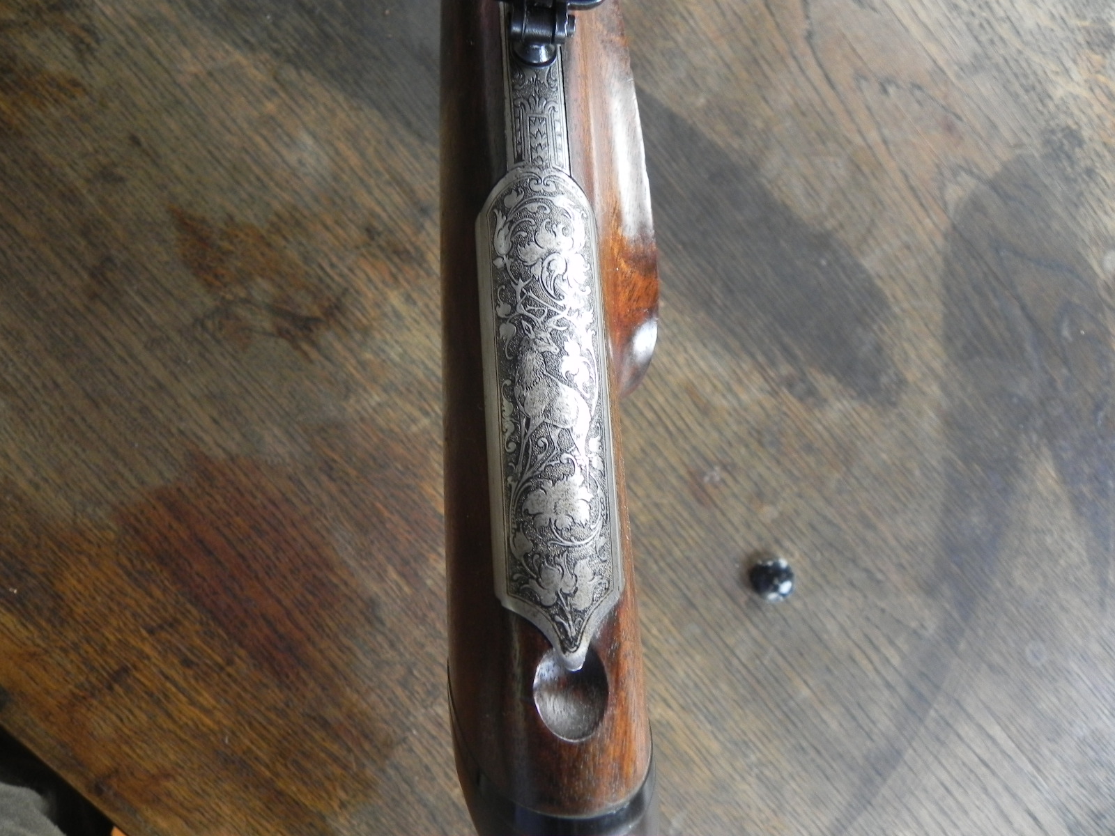Zum Verkauf steht eine absolute Rarität, ein Suhler Hahnbüchsflintendrilling. Dieser hat das Kaliber 7x57R, 20/70 und 22 Winchester Magnum. Der Drilling ist wunderschön graviert, die Läufe innen spiegelblank, Verschluss dicht und verfügt über Schwenkmontageunterteile, so dass einfach ein Zielfernrohr nachgerüstet werden kann. Das abgebildete Oberteil der Schwenkmontage ist eindeutig NICHT Bestandteil der Auktion. Der kleine Kugellauf verfügt zudem über eine Mündungsverstellung, so dass ein perfektes zusammenschiessen beider Läufe gewährleistet ist. Der Schaft besitzt noch ein ebenfalls graviertes Schaftmagazin und fasst drei grosse und drei kleine Kugelpatronen. Der vorder Abzug verfügt natürlich über einen Stecher. Gesamtlänge ca. 100cm, Lauflänge: 58,5cm, Schaftlänge: 36cm