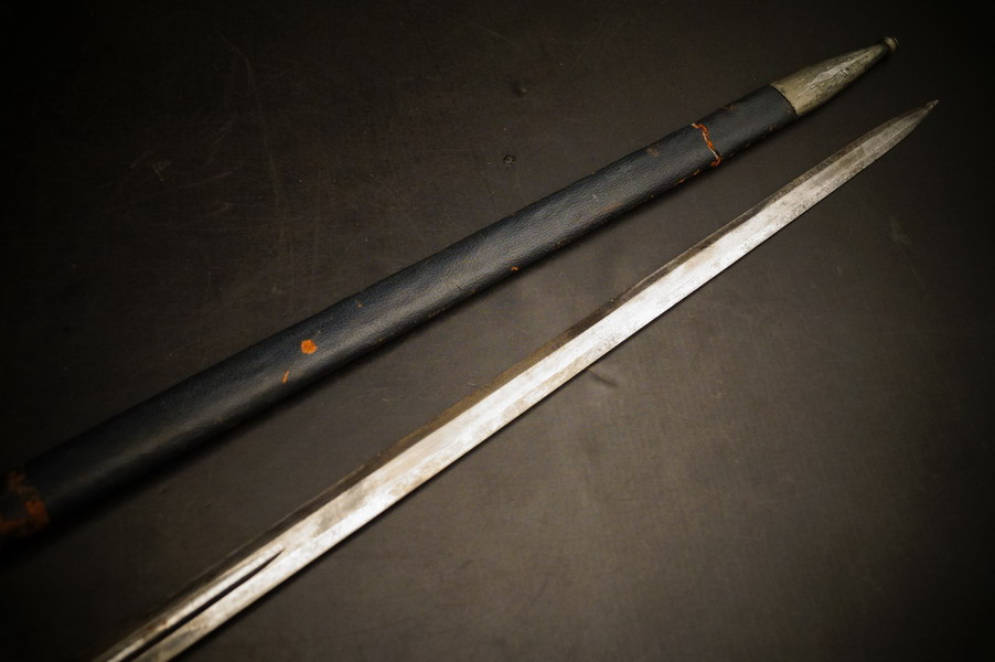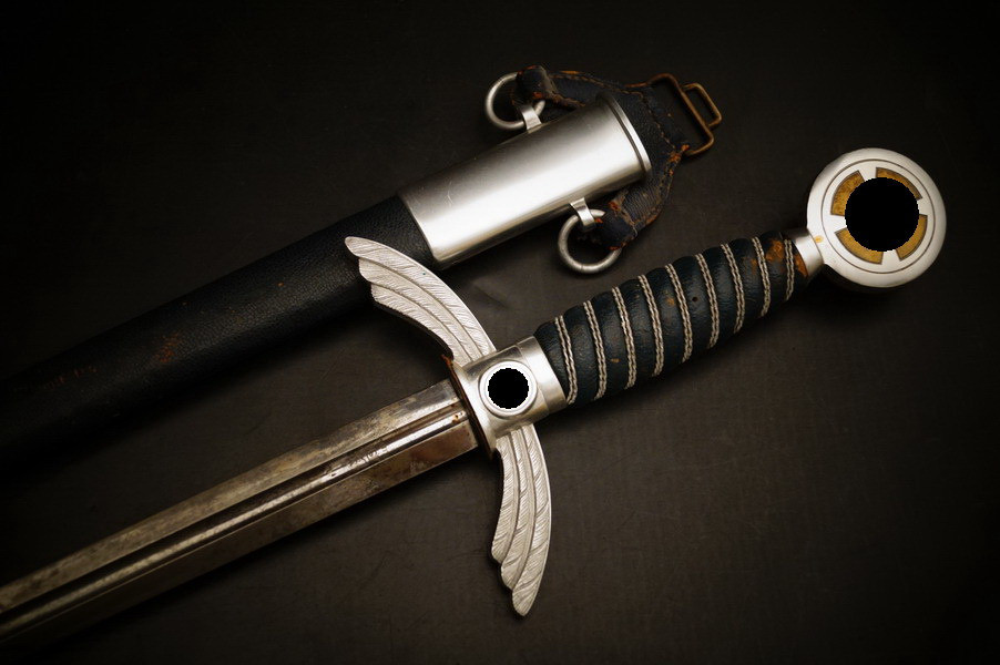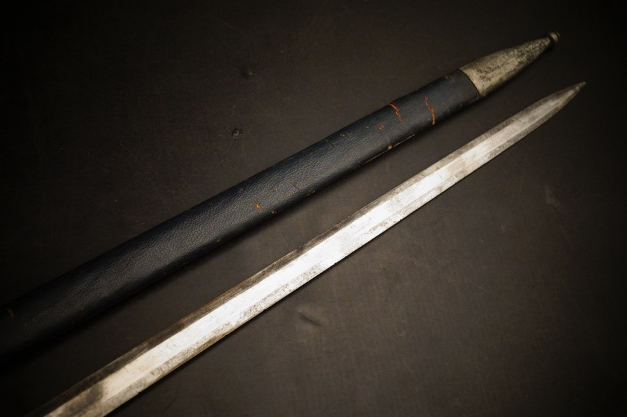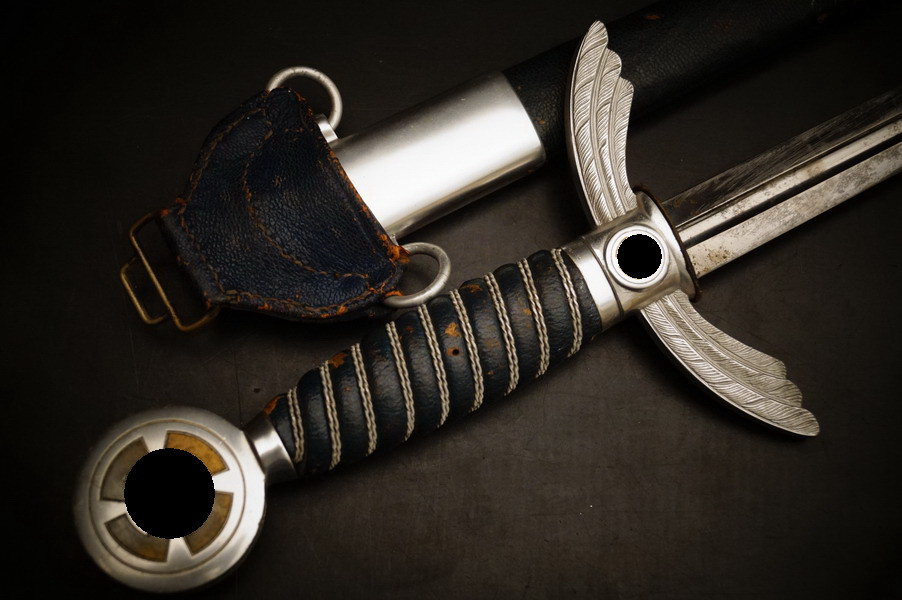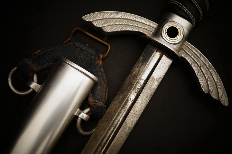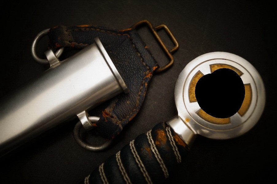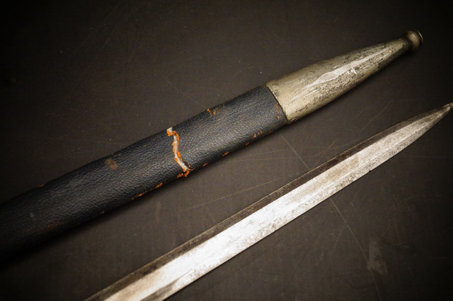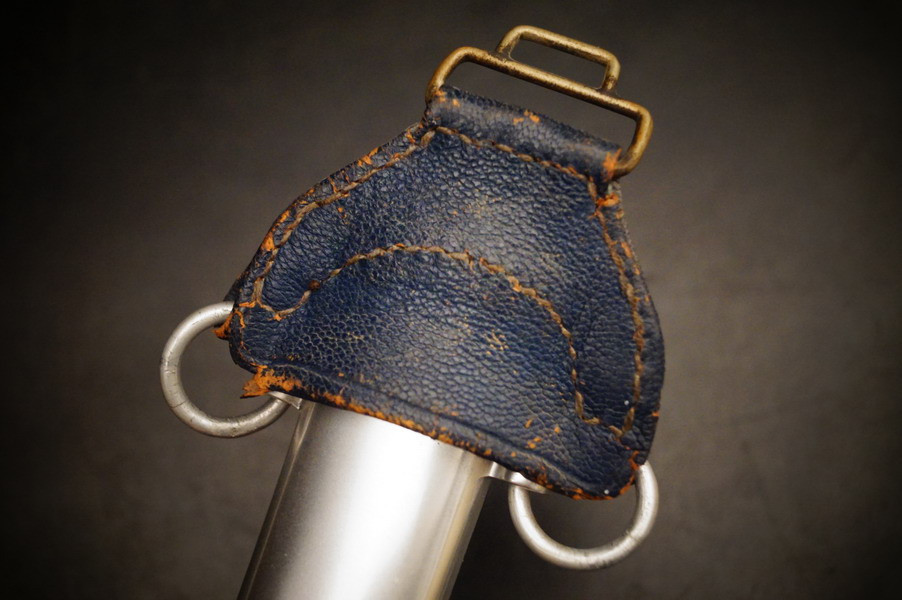 Fundzustand. Aluscheide mit Lederbezug. Saugender Sitz der vernickelten Stahlklinge. Aluteile. Sehr schönes Stück in Fundzustand.