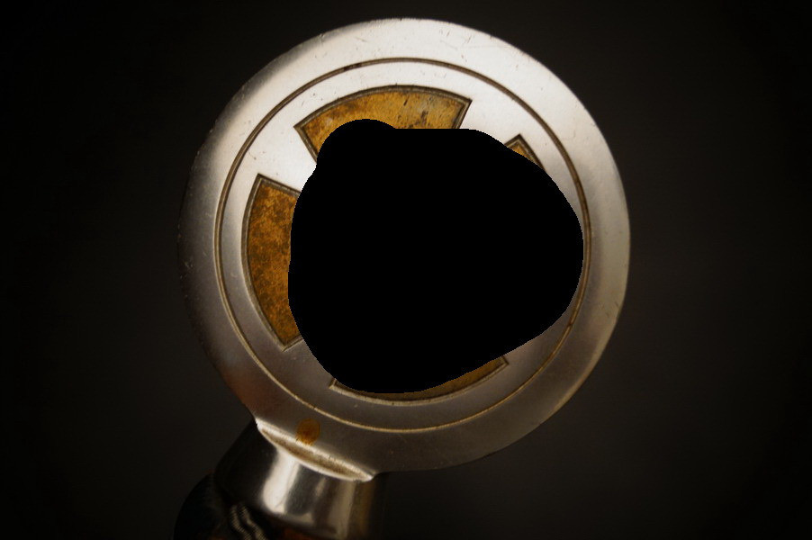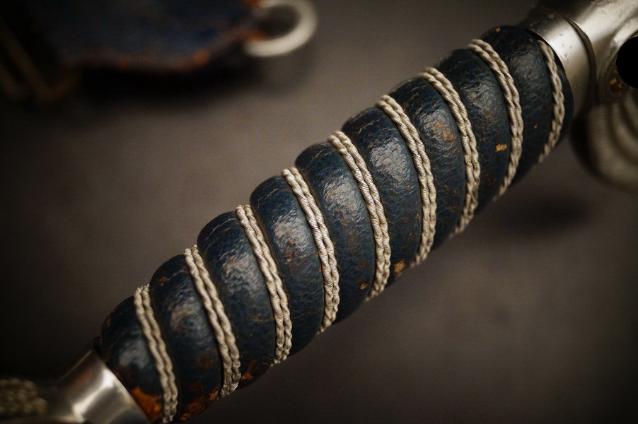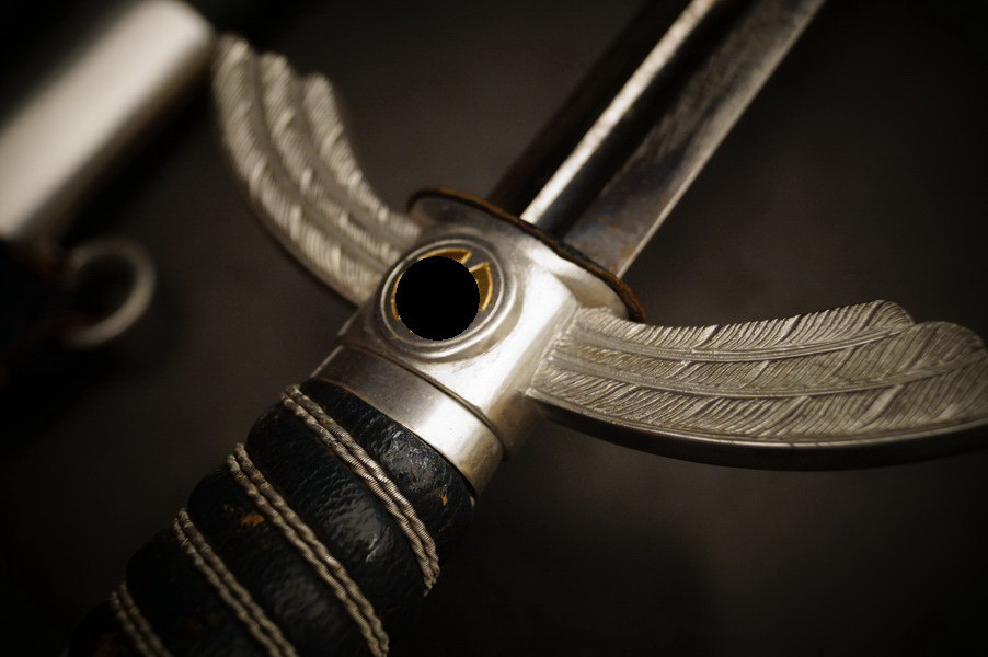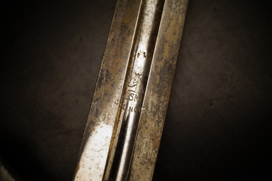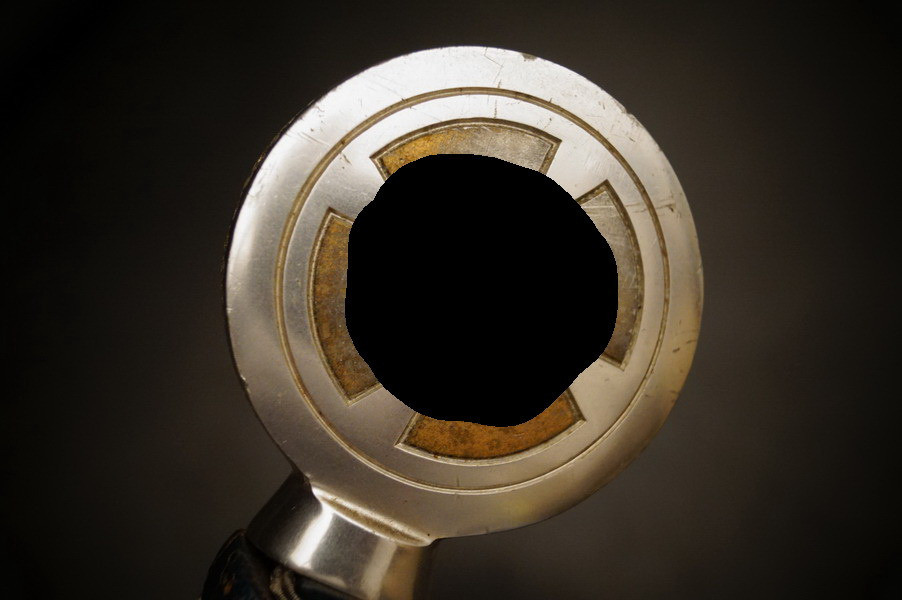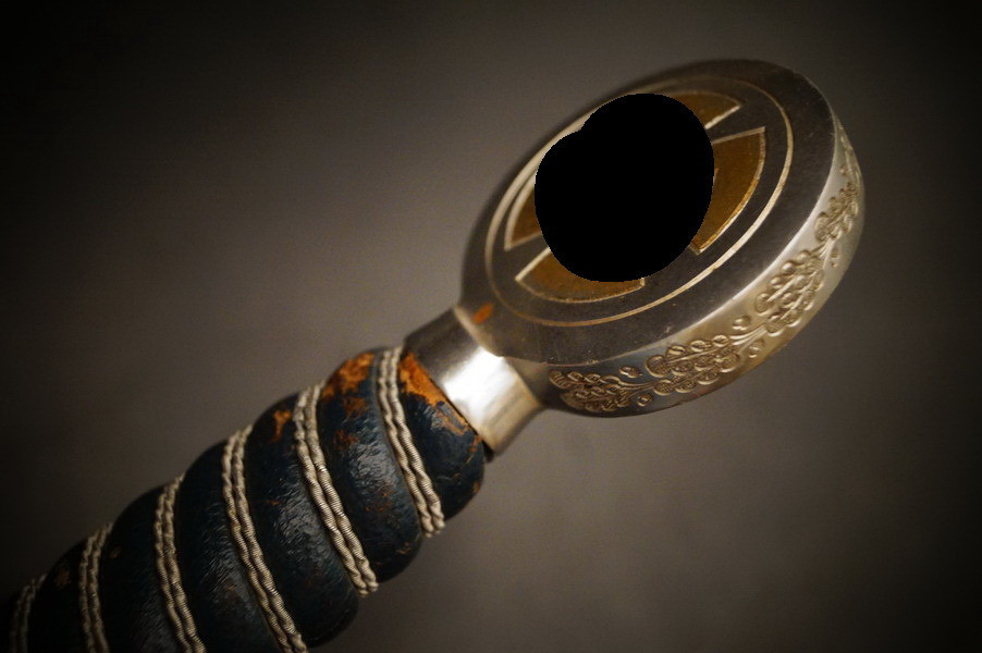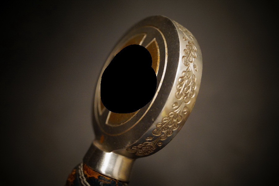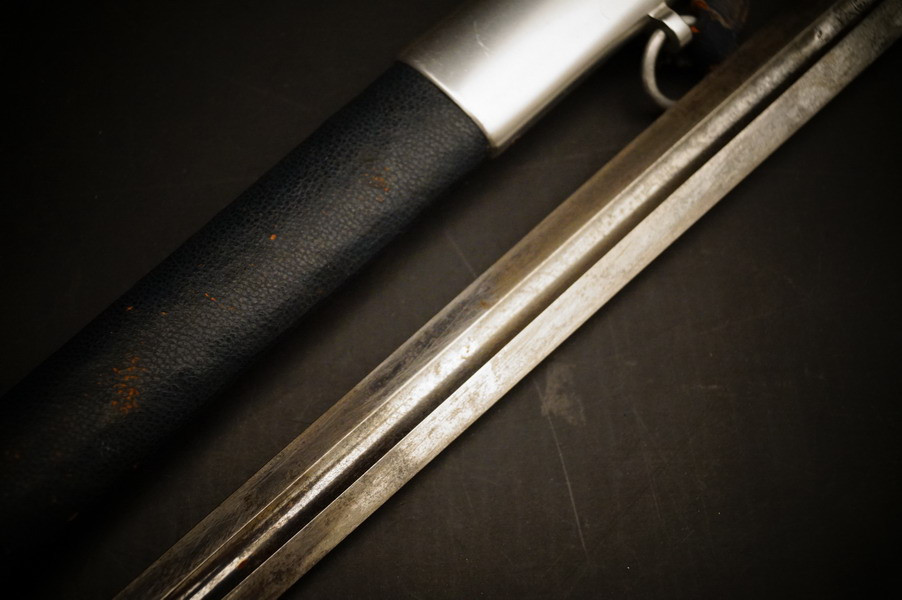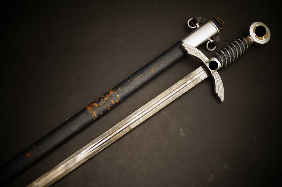 Fundzustand. Aluscheide mit Lederbezug. Saugender Sitz der vernickelten Stahlklinge. Aluteile. Sehr schönes Stück in Fundzustand.