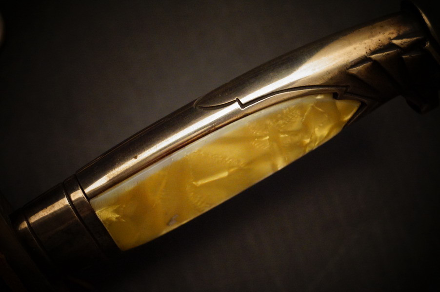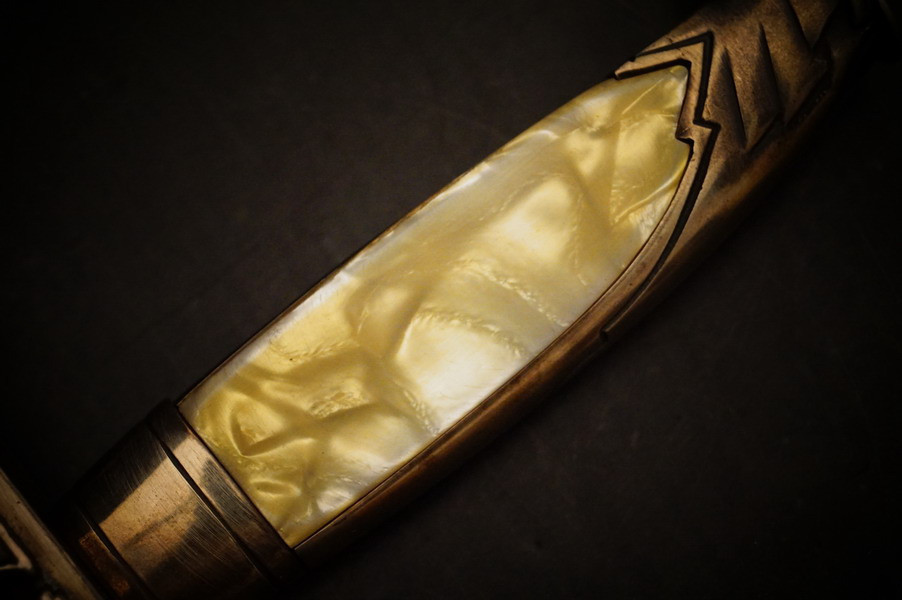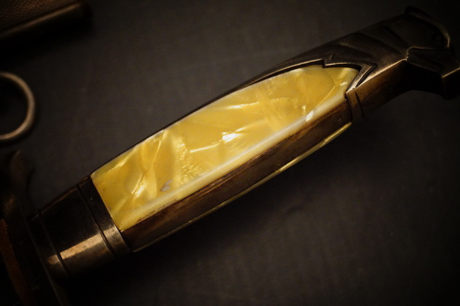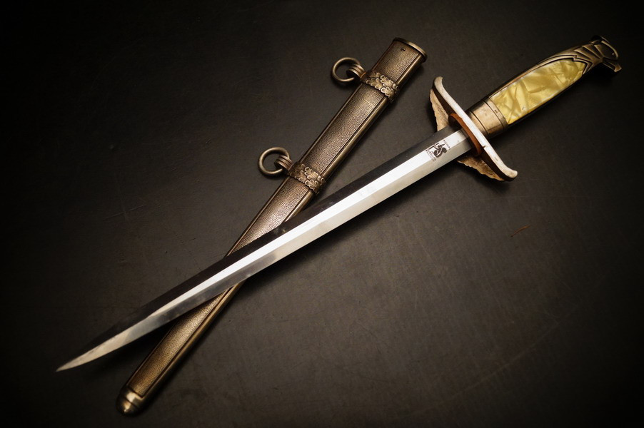 Fundzustand. Neusilberstück. Saugender Sitz in der Scheide. Stahlklinge mit perfektem Schliff und Ätzung vom Hersteller. Mehrteiliges Neusilber-Gefäß. Schlankes Griffstück. Nr.Gleich. Perlmutt- Imit Griffschalen ohne Schäden.
