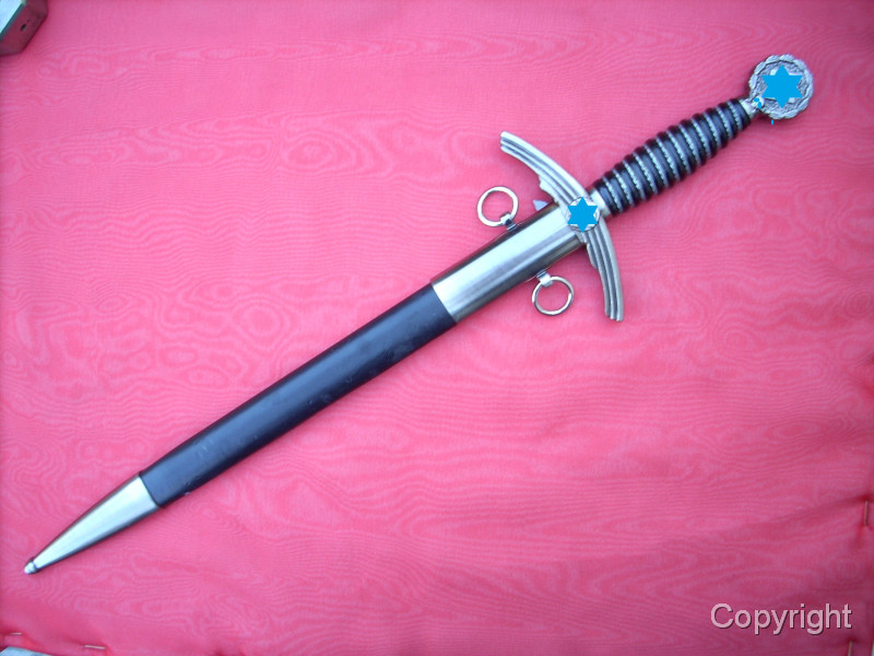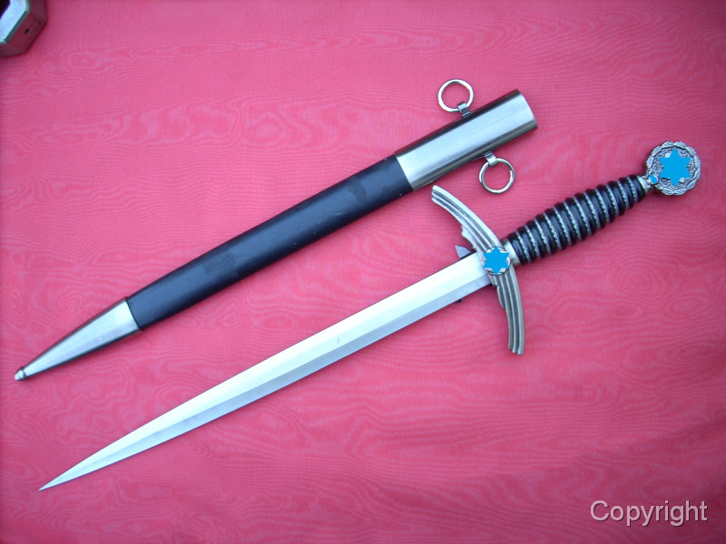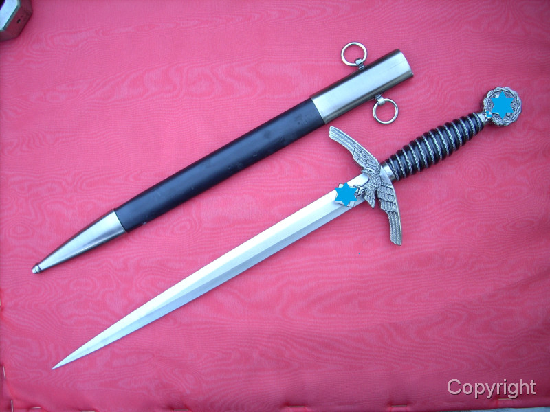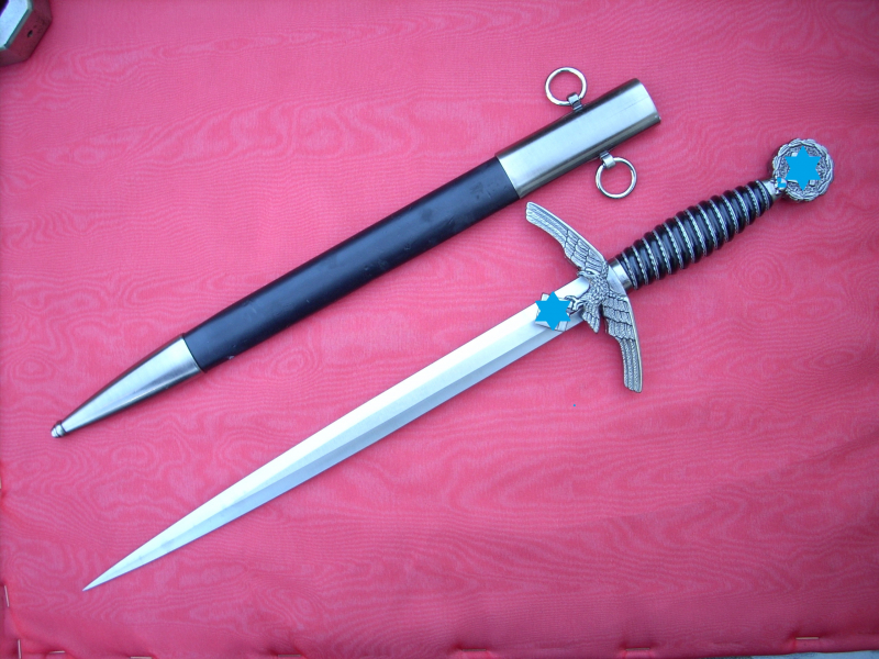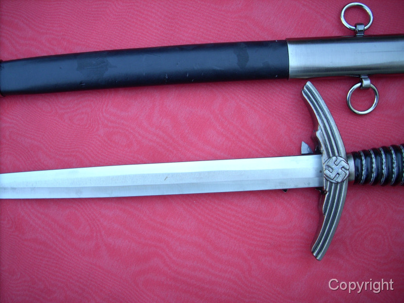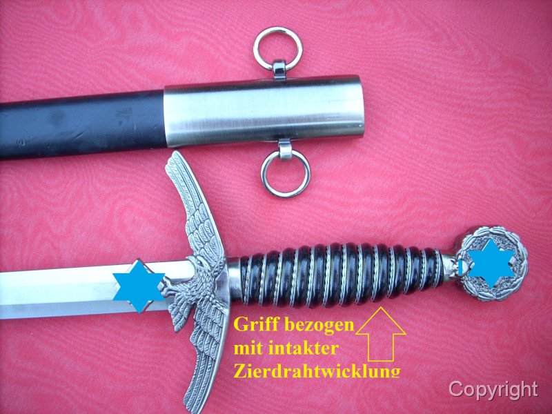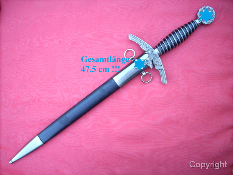 Angeboten wird ein sehr dekorativer Luftwaffendolch / kleines Luftwaffenschwert. Die Parierstange erinnert ein wenig an Görings Hochzeitsschwert, für das eine Ähnliche angefertigt wurde (das originale Hochzeitsschwert liegt als Kriegsbeute in der Militärakademie West Point, USA). Näheres zum hier angebotenen Stück entnehmen Sie bitte den zusätzlichen Infos auf den Fotos. Gesamtzustand siehe Fotos, die, wie immer, Bestandteil der Artikelbeschreibung sind. Keine Garantie und keine Rücknahme.