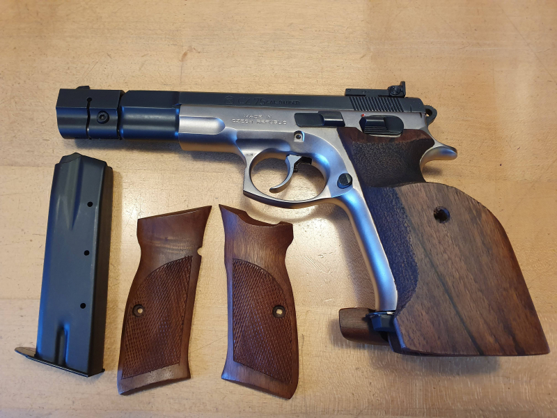 Sportpistole CZ Mod. 75 Sport, Kal. 9 mm Luger. Lauflänge 14 cm, Sportgriffe, zusätzlich Reservemagazin, Nussholzgriffschalen, geringe Schussbelastung - liegt seit 15 Jahren im Tresor, Zustand neuwertig!