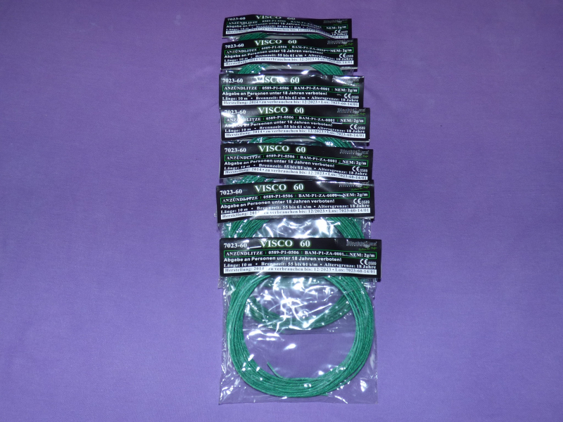 Angeboten wird die Zündschnur/Anzündlitze auf dem Foto. 10 m VISCO 60, Brenndauer: 55-61 sec/Meter. Herstellungsjahr: 2014 zu verbrauchen bis 12/2023. Die Zündschnur ist originalverpackt und wurde in einer luftdichten Alubox kühl und trocken gelagert. Obwohl das MHD abgelaufen ist, brennt die Zündschnur noch einwandfrei (letzten Silvester getestet). Der Preis bezieht sich auf eine Packung zu 10 m. Versand als Hermes Päckchen zum Selbstkostenpreis von 4,89 EUR. Bis zu 2 Packungen können für 4,89 EUR verschickt werden. Bei mehr als 2 Packungen dann 5,49 EUR (Hermes) oder 6,19 EUR (DHL-Paket). Habe noch weitere Anzündlitze von VISCO und WANO im Angebot. Es kann auch "gemischt" bestellt werden (nur einmal Versandkosten entsprechend nach Menge). Frei ab 18 Jahren. Ein Altersnachweis ist erforderlich.