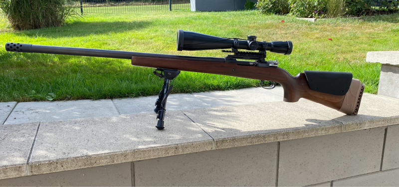 Die Basis ist ein Carl Gustav M63, hier im Kaliber.308 Winchester. Das System ist gebettet und eine Picatinny-Schiene ist verbaut. Montiert ist ein