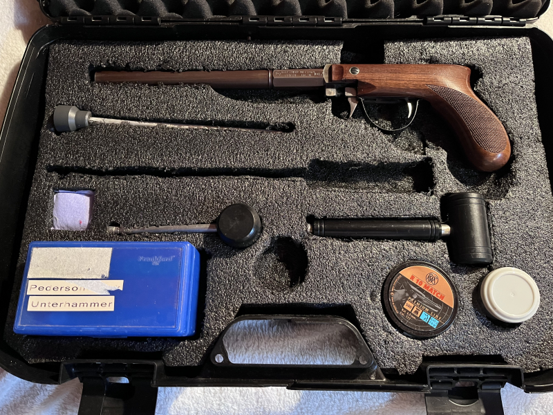 Mit dabei sind ein Waffenkoffer von Pedersoli,Pulverfüllrohr,Ladehammer,einige Kugeln,Schusspflaster sowie Pulverröhrchen in einer Box.