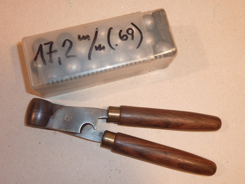 50 gute Kugeln und dazu eine alte aber gute Kugelzange mit Abkneifer im Caliber .69 = 17,2 mm.