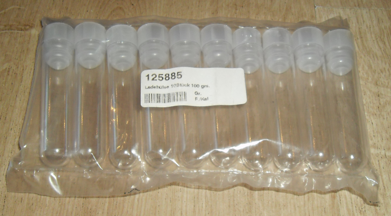 10 Neue Pulverröhrchen bis 100 Grain Schwarzpulver mit Kunststoffstopfen, Abmessung 16mm Durchmesser, Länge 65mm (Abmessung ur das Röhrchen ohne Stopfen gemessen)
