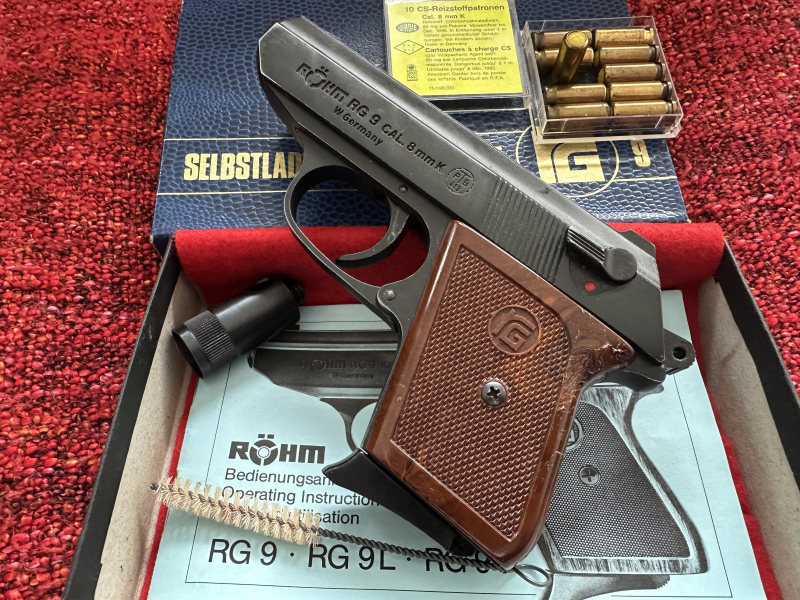 Aus großer Sammlung ,die aufgelöst wird,viel schönes,seltenes dabei aus den besten,frühen Zeiten von Röhm,Erma usw..Wird demnächst eingestellt,bei Interesse einfach anschreiben!Hier eine der BESTEN-zuverlässigsten Taschenpistolen von dem Hersteller scharfer Schusswaffen Röhm !Zuerts als scharfes Modell im Cal.6.35 mm gebaut,meist für den Export,dann ,als es noch möglich und erlaubt war,kam auch diese,freie PTB-Version auf den Markt,selbstverständlich mit allen qualitativen Eigenschaften des scharfen Modells,bis auf den scharfen Schuss!RG 9,Cal.8mm Knall&Gas,Beschussjahr 1990=KE.Sehr stabiler,zuverlässiger "Taschenblitz" für die verdeckte trageweise in diesem schönem,starken Cal.-8mm knallt fürchterlich!Besonders bei diesem Modell macht es es Spaß ,weil ,wie damals noch üblich und erlaubt nur minimalst verbauter Lauf und darausresultierende,perfekte,abschreckende "scharfe " Mündung,heute wäre es so leider absolut undenkbar wegen verschärften PTB-Vorgaben!Leider konnten sich viele Bastler speziell bei solchen,stabilen,hochwertigen Taschenpistolen in diesem schönen Cal.einfach nicht zurückhalten,sodass der Gesetzgeber verständlicherweise reagieren musste...Sammler und Kenner sind hier bestens informiert...So seit über 30 Jahren nicht mehr in der Produktion,nur Altbestand zählt,was man hat,hat man...Lauf,Hahn,Stossboden usw.sind aus STAHL!Double und Single Action Abzug und Sicherung,die zugleich auch auch Entspannhebel Funktion hat.Das hat kein anderes Modell,außer die scharfe Walther TPH,von der sich diese praktisch bis auf den scharfen Schuss nicht unterscheidet!Komplett so mit dem ganzen Zubehör wie aus den Bildern ersichtlich,sehr guter Gebrauchszuszand,einwandfreie Funktion.Was man hat ,hat man,Nur Altbestand zählt.Die Bilder als Beschreibung sind zu beachten.Erwerb/Besitz frei ab 18.Private Versteigerung ab 1€ ohne Rücknahme.EU-Länder Ausland Versandkosten 20€.