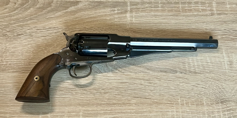 Zum Verkauf kommt ein Vorderladerrevolver im Kal. .44 BP von FAB Pietta. Lauflänge: 16 cm. Das Modell entspricht dem 44RB, wobei der Abzugsbügel buntgehärtet ist. Lauf und System sind poliert und hochglanzbrüniert. Die Waffe weist einen Achtkantlauf und eine starre Kimme auf. Abzug wurde vom Büchsenmacher überarbeitet. Hervorragende Schussleistung. Innen wie Außen präsentiert sich dieser klassische Revolver im Bestzustand. Zubehör gemäß Foto gehört dazu.