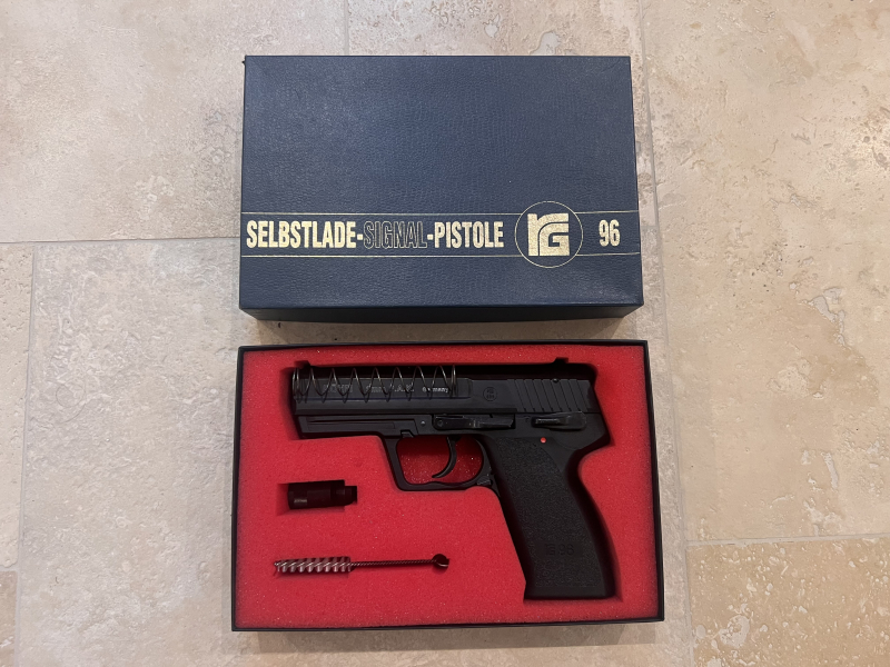 Ich verkaufe aus Nachlass eine Röhm RG 96 9mm Gas/Signalpistole inkl. Originalkarton, Aufsatz für Pyrotechnik, Reinigungsbürste und einer Feder die bei lag. Da sie aus einem Nachlass stammt, kann ich nicht viel dazu sagen, Probeschüsse gab ich nicht ab. Schlitten etc funktionieren auf jeden Fall. Zustand ist OK. Falls noch weitere Fotos gewünscht werden, kann ich diese gerne machen. Bei Fragen gerne melden. Verkauf erfolgt unter Ausschluss der Gewährleistung / Garantie, da Privatverkauf
