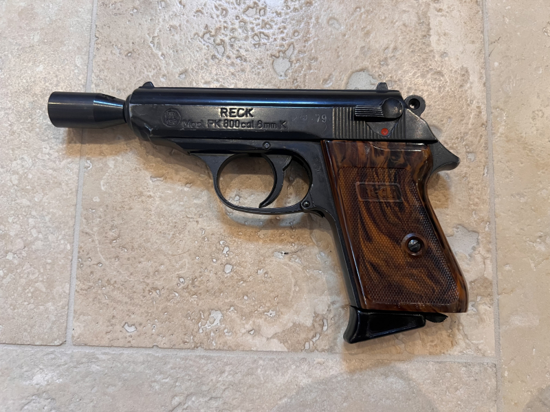 Ich verkaufe aus Nachlass eine Reck Mod. PK 800 8mm inkl. Aufsatz für Signalmunition in gebrauchtem Zustand. Da sie aus einem Nachlass stammt, kann ich nicht viel dazu sagen. Ich habe keine Probeschüsse abgegeben, Schlitten funktioniert, Abzug und Spannhahn ebenfalls, sollte mal gereinigt und geölt werden. Zustand ziemlich gebraucht, aber sollte man auch an den Fotos erkennen. Falls noch weitere Fotos gewünscht werden, kann ich diese gerne machen. Bei Fragen gerne melden. Verkauf erfolgt unter Ausschluss der Gewährleistung / Garantie, da Privatverkauf