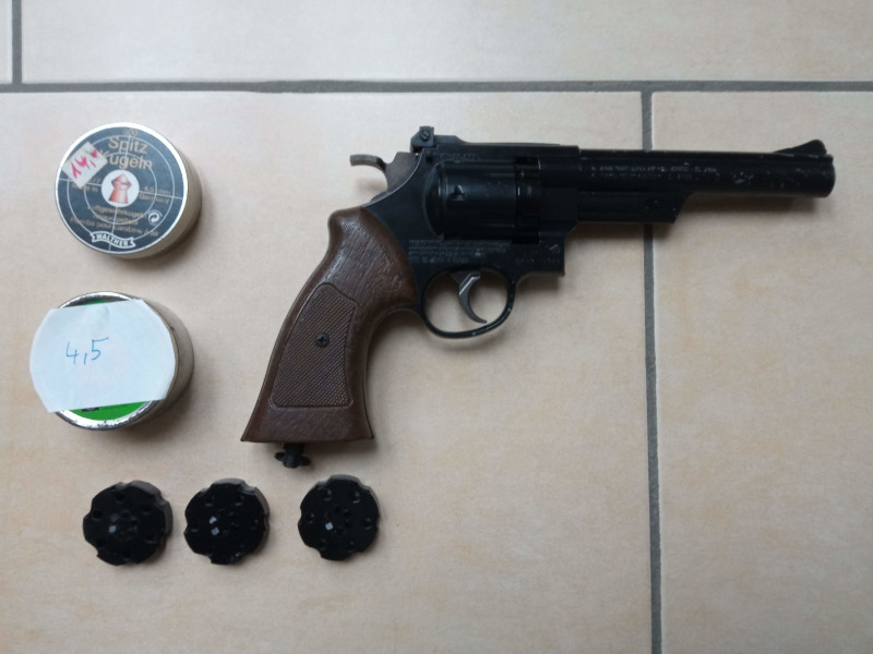 6-schüssiger Revolver für 4,5 mm Diabolo. Antrieb mit 12g-CO2-Kapsel.