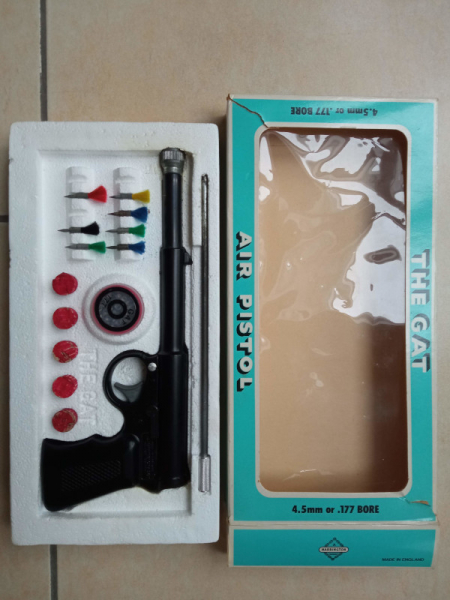 Luftpistole zum verschießen von 4,5 mm Diabolo, Pfeilen und Korken. Einzellader, der nach Zusammendrücken des Laufs von hinten geladen wird. Dazu wird ein Stift herausgeschraubt, das Projektil eingelegt und der Stift wieder hineingeschraubt. Korken werden natürlich nur vorne aufgesteckt. Alter unbekannt. Versand als DHL-Paket mit Ausweiskontrolle € 8,18. Auch als DHL-Päckchen für € 4,19 gegen Vorlage Ausweiskopie möglich.