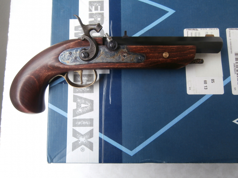 Zum Verkauf angeboten,Sehr schöne Spanische Perkussionspistole, Kaliber 45(nur für schwarzes Schießpulver).wenig benutzt(3-5 mal)und hat noch Sehr gute Zustand.Farbe:Dunkelbraun(kirschbraun).gesamtlänge:ca. 29,5 cm. Privatuktion. Keine Rücknahme. Versand nur nach Deutschland !!! lichtflecken am Lauf der Pistole, das ist kein Defekt, es sind Blendung von der Kamera PS. Auf Wunsch kann ich weitere 10-15 Fotos an Ihre E-Mail-Adresse senden.