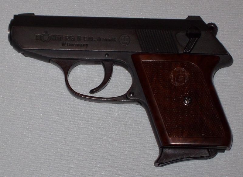 Röhm RG 9 in 8mm Knall. Kunststoffgriffschale rechts ein Stück ausgebrochen, ohne Abschussbecher. Privatverkauf im Auftrag eines Freundes