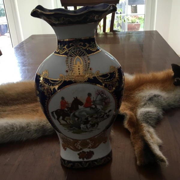 Elegante dekorative Vase mit jagdlichem Motiv . Beidseitig Parforcereiter mit Jagdhunden. Die Vase ist ca. 30 hoch, 15cm breit, 9cm tief.