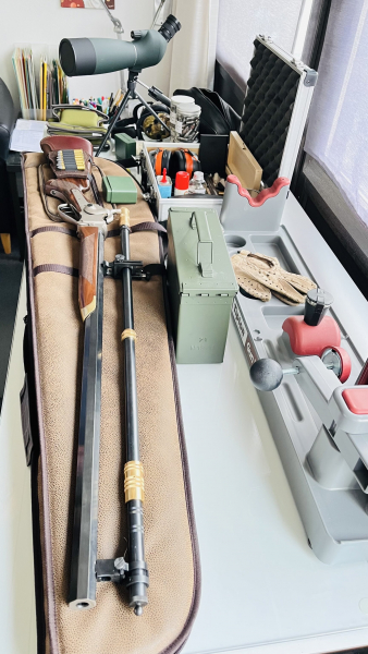 Mit der 2022 gekauften Saguaro-Sharps wurden viermal je 20 Schuss abgefeuert, dabei sind 50 patentierte Saguarohülsen Cal. 45/70 und alles Zubehör, dass man zum Wiederladen braucht. Es handelt sich um die Saguaro Sharps Competition Short (30" Lauf, doppelte Dicke), Rückschlag sanft, da Schaftkappe und Patronenhalter für Schaft dabei...