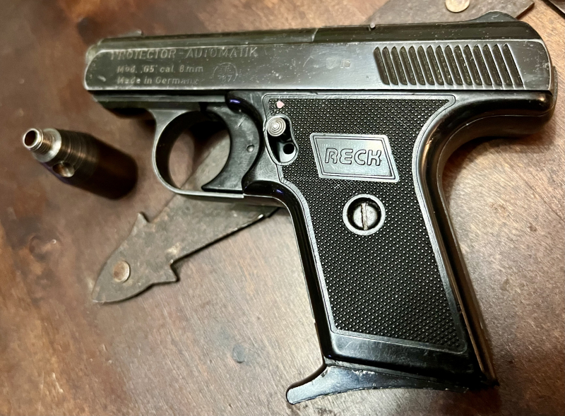 Zum Verkauf steht eine Reck Protector Automatik Schreckschusspistole im Kaliber 8 mm. Hat gewisse Gebrauchsspuren. Griffschalen sind eigentlich neu, nur ist die linke leider ausgebrochen. Siehe Bilder. Ist aber kein Problem, da die Griffschalen und einige andere Teile von der Reck Goliath passen und heutzutage noch problemlos zu bekommen sind. Zustand und Lieferumfang siehe Bilder, die Bestandteil der Artikelbeschreibung sind. Keine Garantie, Rücknahme oder sonstiges, da ich Privatperson bin. Abschussbecher ist dabei. Ob es der originale ist kann ich leider nicht sagen aber passt einwandfrei. Die Waffe funktioniert einwandfrei, hab sie erst Probe geschossen. Wenn es Durchladeprobleme oder Klemmer gibt , liegtdad wahrscheinlich an der neuen Munition die weniger Ladedruck als die alte von damals hat. Lösung wäre evtl eine schwächere Rückholfeder. Bei Fragen bitte gerne melden!