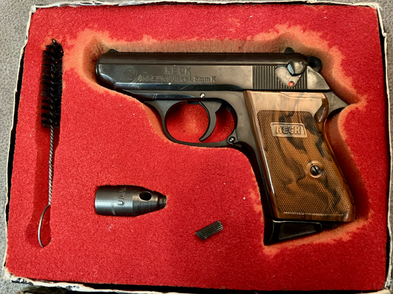 Zum Verkauf steht eine Reck PK800 Schreckschusspistole die noch einwandfrei funktioniert. Sie kommt komplett und in Originalverpackung, die zugegeben schon etwas mitgenommen ist. Die Waffe funktioniert einwandfrei trotz der zwei kleinen Mängel die da wären: der Flügel der Sicherung ist abgebrochen, die Öse am Abzugshebel hat einen kleinen Riss. Bitte Bilder beachten, sie sind Bestandteil der Artikelbeschreibung. Keine Garantie oder Rücknahme, da ich Privatperson bin. Bei Fragen bitte gerne vorher anschreiben.