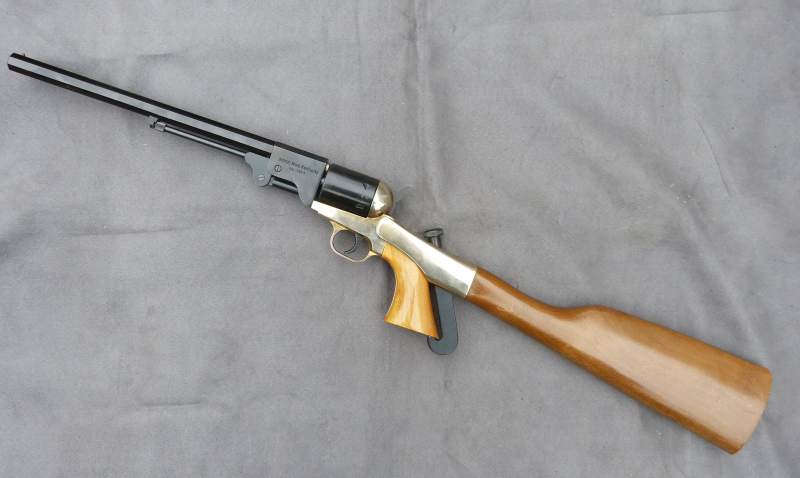 Original Reck Kentucky Single Action Langrevolver mit original zugehörigem Anschlagschaft als Revolvergewehr. PTB 337 im Kaliber 9mm Rand Knall/Gas. Beschuss Köln 1984. Gesamtlänge 77cm. Lauflänge 30cm (!), Länge Revolver 45cm. Bestempelung Bundesadler mit „N“ für Normalbeschuss auf Rahmen und Trommel. Der Revolver hat in dieser Sonderserie vom Hersteller RECK werkseitig Aufnahmepunkte für die Befestigung des zugehörigen Anschlagschafts. Gepflegter Zustand, technisch einwandfrei mit leichten Gebrauchsspuren.