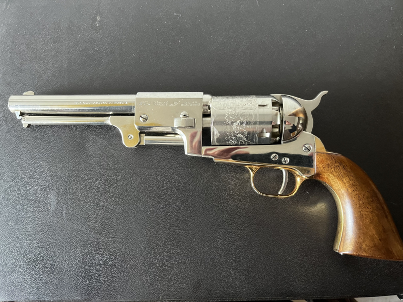 Dieser Perkussionsrevolver ist verchromt und vergoldet und ist noch nie geschossen worden.