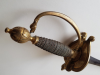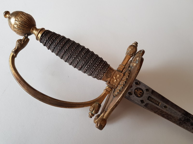 Preußischer Degen mit Empire Gefäß , nach französischem Muster , um 1790 / 1800 . Bezeichnung „ Berlin „ sowie 4 Schmuckelemente sind beidseitig in in Klinge eingelegt , Klinge ist vom Typ C (um 1750) . Die Feuervergoldung ist altersgemäß noch gut erhalten . Die Griffwicklung ist komplett vorhanden . Der seltene Degen ist ohne Scheide ! Die Klinge hat ein paar kleine dunkle Flecken . Gesamtlänge ca. 104 cm . Klingenlänge ca. 88 cm . Die Klinge wird beschrieben im Buch ,