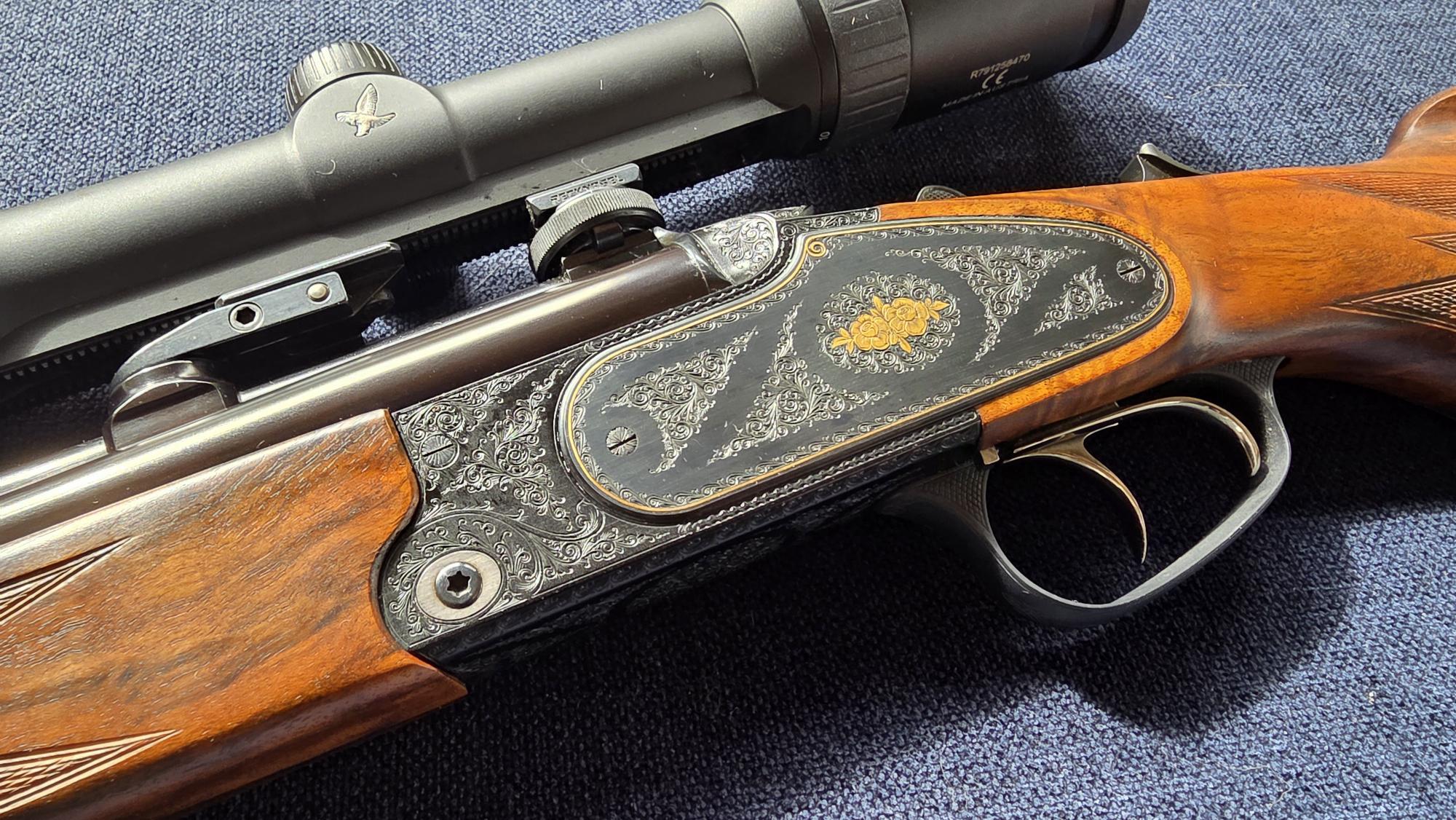 Beschreibung Dieser Prinz-Vierling vereint Vielseitigkeit und Eleganz: zwei starke Büchsenläufe für größere Wildarten, einen feinen .22 Hornet-Lauf für die präzise kleine Jagd und einen Schrotlauf für Stücke, bei denen Schrot erforderlich ist. Die Kombination wird ergänzt durch ein erstklassiges Swarovski Z6i 1,7–10×42, das optisch und funktional auf höchstem Niveau ist. Die Waffe wurde nur sehr selten benutzt und war überwiegend ein sorgfältig gehütetes Schrankstück — daher präsentiert sie sich in nahezu neuwertigem Zustand. Die Gravuren sind aufwendig und verleihen dem Stück einen hohen ästhetischen Wert.