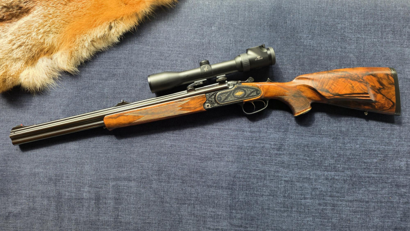 Konfiguration (Vierling): 2 × 8×57 JRS (Büchsenläufe), 1 × .22 Hornet (Präzisionslauf), 1 × Schrotlauf 20/76 (Schrot).