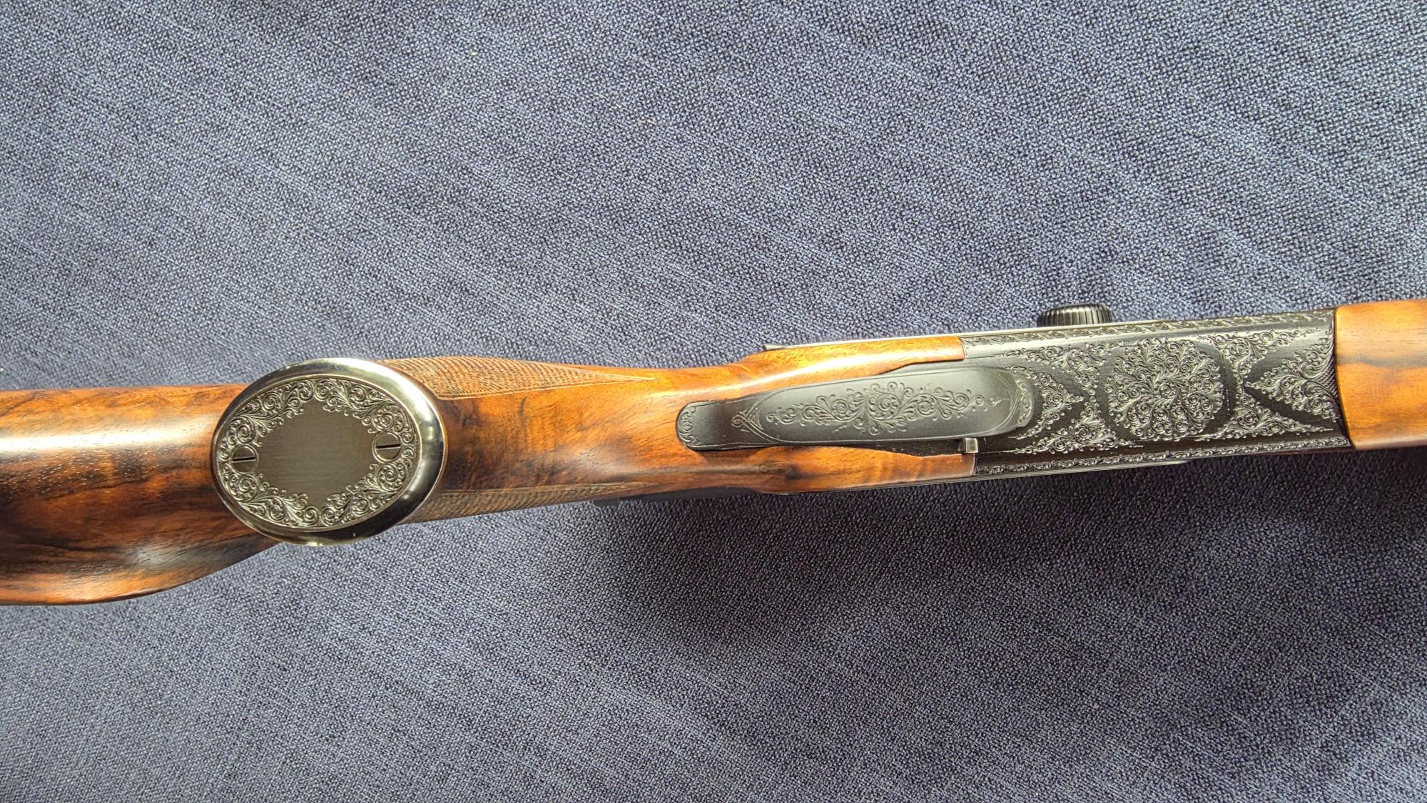 Zum Verkauf steht ein außergewöhnlicher Prinz-Vierling aus dem renommierten Waffengeschäft Prinz (Maierhöfen) — ein technisch einwandfreies, ästhetisch herausragendes Sammler- und Jagdstück in sehr gutem Zustand. Diese Kombination aus meisterhaftem Handwerk, aufwendiger Verzierung und hervorragender Optik ist extrem selten auf dem Markt und bietet sowohl hohen Nutzungswert als auch deutlichen Sammlerwert.