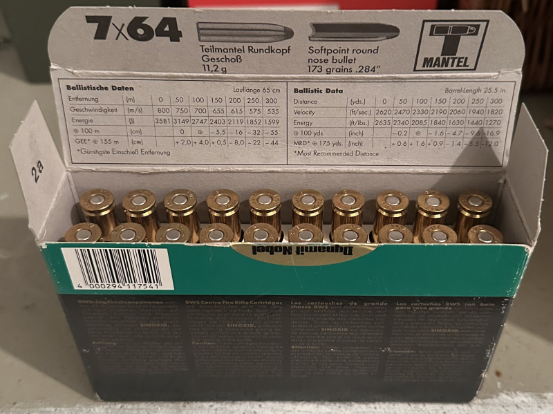 Sie bieten hier auf eine Schachtel 7x64 Teilmantel RK 11,2g ais dem Hause RWS. Ein Los. 20 Schuss.
