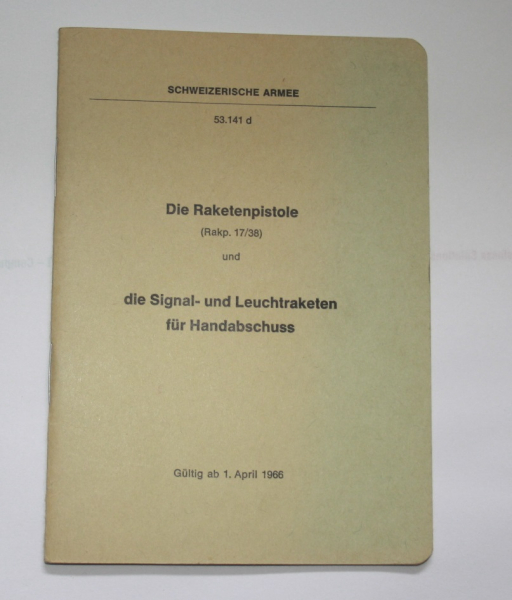 Originale Dienstvorschrift der Schweizer Armee von 1966 "Die Raketenpistole". Format 10,5 x 14,9 cm, 30 Seiten mit Text und Bildern.