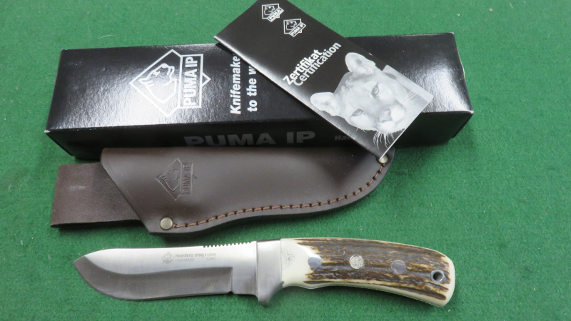 1 Puma IP Messer <"Montero stag" Hirschhorngriffschalen, Sattellederscheide, Puma <Pappbox, Garantie-Zertifikat, Zustand neu/unbenutzt. Klingenlänge: 11.7 cm.